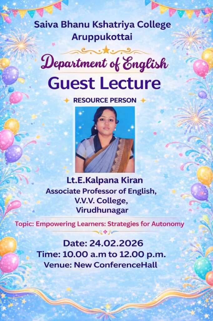 Event Information Location New Conference Hall, SBK College, Aruppukottai Start Time 10:00 am February 24, 2026 Finish Time 12:00 pm February 24, 2026 Share: Previous Event Guest Lecture Programme